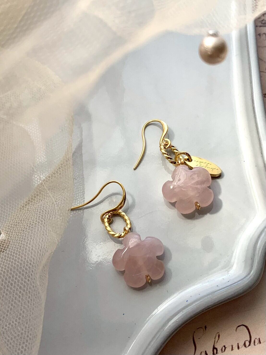 天然のローズクォーツの桜カービングを使用しており、天然ならではの色合いや風合いが、耳元を一層華やかに引き立てます.